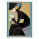 Un ilustracion de arte supervintage de una dama con un hermoso vestido negro y un gorra tomando té.