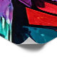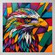 Arte vibrante y colorido de águila. La cabeza del águila se representa en un estilo llamativo con capas de formas geométricas audaces y colores brillantes, incluyendo rojos, azules, verdes y amarillos. Las plumas están estilizadas con detalles intrincados, mostrando una variedad de tonos que crean una sensación de profundidad y movimiento. El fondo consiste en patrones geométricos igualmente coloridos que mejoran la composición dinámica general. El ojo penetrante del águila añade un punto focal intenso a la pieza, transmitiendo fuerza y majestuosidad.
