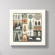 Diseño geométrico minimalista con un bosque estilizado con árboles abstractos y siluetas animales.