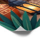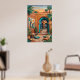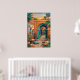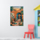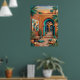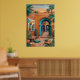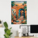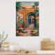 Atardecer en el patio con arcos turquesa, paredes de terracota, palmeras, arte de pared geométrico, linternas, plantas de cactus, cojines tejidos y alfombras estampadas. Vibra riads boho exótico bajo el resplandor del atardecer naranja. Perfecto para sala, dormitorio, decoración global—impresión de arte digital de alta resolución.