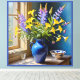 Arte de Bouquet azul amarillo morado. Captura la tranquilidad con esta serena y estilizada acuarela que sigue siendo la vida de las flores en un jarrón con delicadas flores en azul, amarillo y violeta. Perfecto para el arte en la pared y tarjetas de felicitación.