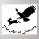 Una audaz silueta de un halcón de cola roja persiguiendo a un conejo jackrabbit con las palabras El arte de la Falconería debajo.
