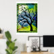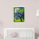 Arte de Marta Harvey. Esta pieza fue creada cosiendo un árbol sobre un lienzo pintado y una luna metalizado. Los bordes se terminaron con lápiz y tinta.