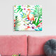 Una obra de arte tropical con un flamenco rosa y plantas verdes de selva tropical con fondo blanco. Una divertida y colorida obra de arte para tu casa u oficina.