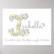 Hermoso cartel con monograma de la letra I y nombre personalizado perfecto para el dormitorio o sala de juegos de una niña en tonos de gris, blanco, amarillo, rosa y morado. Personaliza con el nombre de tu hijo que comience con J, y el significado del nombre para un regalo verdaderamente personalizado y único para el dormitorio o nursery de tu hijo, este ejemplo es para el nombre I Isabella Devota a Dios. Hermosa, enérgica y talentosa. Impresión de cartel lindo ideal para un regalo de nuevo bebé, bautizo o baby shower. © Diseño único de monograma de letra I con corazones y flores y arte gráfico por Sarah Trett. www.sarahtrett.com para www.mylittleeden.com
