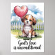 Una ilustración de acuarela de un cachorro sosteniendo un globo en forma de corazón. El cachorro está sentado en un campo de hierba. El fondo contiene una cerca blanca y un cielo azul con nubes blancas esponjosas. El texto "El amor de Dios es incondicional" está escrito en letra cursiva en la parte inferior.