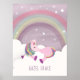 Arte para guardería que presenta una ilustración de un unicornio bebé durmiendo en una cama de nubes rodeado de estrellas y un arcoíris. El fondo es de acuarela púrpura inspirada.