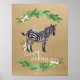 Impresión dulce de cebra, con fondo marrón kraft, vegetación en acuarela y flores rosadas, y texto en caligrafía blanca. *Arte de GraphicBox y WhiteHeartDesign