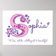 Hermoso cartel con monograma de la letra S perfecto para el dormitorio o sala de juegos de una niña en tonos de blanco, rosa y morado. Personalízalo con el nombre de tu hijo que comience con S y el significado del nombre para un toque verdaderamente personalizado en el dormitorio o nursery de tu hijo, este ejemplo es para el nombre Sophia Wise, astuta, inteligente y hermosa. Impresión de cartel linda ideal como regalo para un bebé recién nacido, bautizo o fiesta de bebé. © Diseño de arte gráfico y descripción de dibujo de monograma de letra S única con corazones y flores por Sarah Trett. www.sarahtrett.com para www.mylittleeden.com