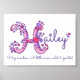 Arte de letra mayúscula monograma H con letras bonitas, póster de nombre perfecto para el dormitorio o sala de juegos de una niña en tonos rosa y púrpura. Personalice con su propio nombre que comience con H y el significado del nombre para un toque verdaderamente personalizado en el dormitorio o la guardería de su niña. Este póster dice nombre Hailey prado de heno. Una pequeña ola, salvaje y llena de espíritu. Impresión de póster linda ideal para un regalo de bebé recién nacido, bautizo o fiesta de bebé. © Diseño de arte gráfico y dibujo de corazones y flores con monograma de letra H única por Sarah Trett. www.sarahtrett.com para www.mylittleeden.com