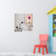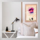 Un dormitorio moderno cuenta con una mesita de noche blanca con una lámpara negra y objetos decorativos, junto a una cama con almohadas estampadas. Un cuadro enmarcado que representa labios vibrantes y dos personas sentadas añade un toque de color al decorado minimalista. Una divertida imagen dentro de una imagen.