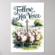 Una ilustración en acuarela de un cayado de pastor con una cruz en la parte superior, rodeado de un rebaño de ovejas. El cayado y las ovejas están colocados en un campo verde. Sobre la escena, el texto 'Sigue su voz' está escrito en una fuente decorativa y cursiva. El fondo contiene algunos árboles.