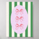 Encantador arte de pared con tres lazos rosas sobre un fondo a rayas verdes con un centro ovalado pastel suave. Un diseño dulce perfecto para habitaciones de bebés, decoración femenina o interiores con estilo preppy y grandmillennial.