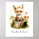 Un adorable zorro bebé sentado en un tocón de árbol arte de pared de nursery. Personaliza el dicho a lo que quieras.