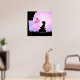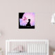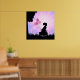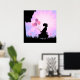 Hermosa silueta de una niña con globos rosados y mariposas rosadas contra un fondo de explosión solar rosa y púrpura arte de impresión para pared de oficina.