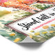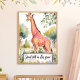 Una ilustración de acuarela de una jirafa que se mantiene erguida entre una suave vegetación. La jirafa tiene un patrón único de manchas rosadas y naranjas en su cuerpo. Hay hojas y ramas en el fondo. El suelo está cubierto de flores amarillas. Hay una tabla blanca debajo de la jirafa con el texto "Mantente erguido en su gracia". El fondo contiene algunos árboles y un edificio.