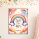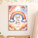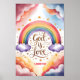 Un arcoiris de acuarela pastel rodeado de nubes suaves y estrellas doradas, con la frase "Dios es Amor" en caligrafía delicada.