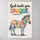 Una ilustración de acuarela de una cebra con rayas coloridas. La cebra está parada sobre un fondo liso. Sobre la cebra, está el texto "Dios te hizo único.".