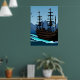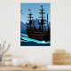 Un barco navegando en el océano abierto con la montaña en el fondo, arte píxel. Esto es un arte generado por IA.