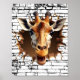 Un impresionante poster de pared en 3D con una jirafa realista que emerge a través de cemento rajado con follaje tropical detrás. La obra de arte hiperdetallada crea una ilusión de profundidad y movimiento, ideal para los amantes de los animales y de la decoración de temática safari.