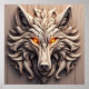 La intrincada talla de la cabeza de lobo presenta patrones geométricos, resaltados hermosamente contra tablas de madera rústica. El diseño detallado y los colores vívidos muestran la habilidad experta y la creatividad artística.