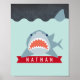 Este cartel de arte de vivero y habitación de niños presenta un fondo azul marino con una boca abierta de tiburón bajo el agua azul claro y una aleta de tiburón sobre el agua. Personalice según sus necesidades. Puede encontrar más productos coincidentes en mi tienda.
