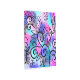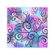 Un pequeño pájaro gracioso en la esquina superior izquierda y elementos florales en un fondo rosa, violeta y turquesa.