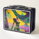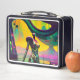 Esta caja de almuerzo artístico con robots de ciencia ficción de ensueño presenta dos pinturas del surrealista norteamericano Ken Gage. En el frente está el puente sobre el Robot Kwai. En la parte de atrás, Dreamer Psiconauta. Perfecto para un tote de convenciones o sólo una visita regular a su sanatorio local para tomar un aperitivo.