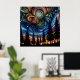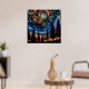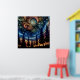 Arte de arte místico con un cielo azul y naranja agitado con siluetas de pinos.