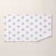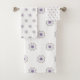 Un diseño de arte fractal de color morado y dorado está embaldosado a través de este juego de toallas de baño. El diseño tiene un aspecto floral. El fondo es blanco. También hay accesorios de baño a juego.