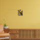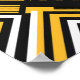 El diseño es una composición geométrica abstracta compuesta por líneas y formas nítidas e interrelacionadas en amarillo, negro y blanco. Presenta patrones tipo chevron, triángulos y rayas diagonales dispuestos en un diseño simétrico pero dinámico. Algunas secciones contienen puntos separados de manera uniforme, mientras que otras tienen líneas paralelas de grosor variable. El efecto general crea una sensación de profundidad, movimiento y precisión, y los colores contrastantes realzan el aspecto audaz y moderno.