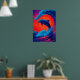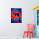 Un delfín expresionista vibrante que vuela a través de una dramática ola del océano bajo una puesta de sol ardiente. Colores contrastantes audaces y movimiento fluido crean un símbolo poderoso de libertad y energía oceánica. Perfecto para decorar casas de playa, amantes de la vida marina e interiores artísticos modernos.