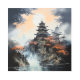 Pagoda a orillas del río y florecimiento del cerezo. Palacio, acantilados rocosos, pájaros de las montañas y ambiente de luna llena. Arte tradicional japonés colorido, paisaje y naturaleza, acuarela. Arte tradicional de estilo oriental en la cultura asiática.