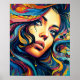 Este es un poster divertido en un estilo de arte pop de la cara de una mujer con colores vibrantes para decorar su habitación, salón, oficina con.