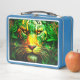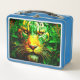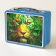 Esta caja de almuerzo tiene un león artístico encima.