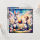 Un lindo niñito vestido con un traje de conejo de Pascua, celebrando Pascua con el conejo de Pascua. Los saludos en la tarjeta son "Feliz Pascua Ashton". En la parte trasera de la tarjeta hay una pequeña versión de la imagen delantera y mucho espacio para escribir un mensaje. Se trata de un cuadro generado por computadora hecho con la ayuda del Creador de imágenes de AI Bing.