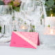Rosas geométricos Red Boda Folded Place Card presenta un patrón geométrico de rosas con color rosa, coral y rojo con color rojo complementario que se mezcla armoniosamente como uno. La tipografía inclinada crea un estilo único con la franja rosa de coral que resaltar.