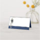 Bonito boda doblado de la tarjeta de lugar hecho en blanco, con gráficos de una pluma de pavo real, perlas, florecimiento de plata. La parte posterior y la parte inferior se hacen en azul sobre damasco azul con un borde de acento plateado. El interior de la carpa de estilo se hace en el mismo patrón de damasco azul. Personaliza a mano para cada persona en tu recepción.