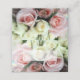 Elegante tarjeta de lugar plegado con una fotografía de rosas rosas rosas y blancas como fondo. El interior de la carta de la plaza está pintado de rosa pálido. En la parte delantera de la tarjeta hay un espacio rectangular de color blanco y semitransparente que podrás personalizar a mano para tu recepción de bodas.