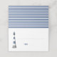Un diseño elegante y sencillo, con un faro pintado a mano en un tono azul y blanco con rayas en el fondo. La línea superior del frente es para los nombres de los invitados y se puede quitar. La línea de abajo es para el número de tabla.