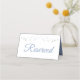 Estas hermosas tarjetas de visita son una buena manera de que sus huéspedes sepan qué asientos están reservados para la familia y otros invitados especiales. Diseñado como parte de nuestra suite nupcial elegante azul y gris. Presenta un diseño sencillo y elegante con texto azul claro sobre un fondo blanco con un Relieve metalizado floral plateado.