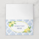 Use esta hermosa tarjeta plegable italiana de baldosa azul limón para su evento como tarjetas de comida, tarjetas de lugar, tarjetas de actividad, y más. Con un estilo toscano de Positano, esto es perfecto para cualquier evento de primavera o verano.