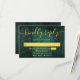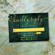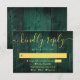 Una tarjeta de confirmación de boda boho de madera rústica verde esmeralda con tus datos en tipografía dorada moderna. Diseñado por Thisisnotme©
