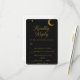 Esta tarjeta de respuesta para una boda celestial presenta un dramático fondo negro con letras doradas brillantes, luna creciente, sol radiante y acentos de estrellas dispersas. El elegante diseño combina la sofisticación clásica con un tema cósmico moderno, lo que lo convierte en la tarjeta de respuesta perfecta para bodas bajo las estrellas, celebraciones nocturnas y eventos inspirados en lo celestial. Totalmente personalizable con sus nombres, fecha de la boda y opciones de comida, esta tarjeta de respuesta coordina perfectamente con invitaciones, anuncios de "save-the-date" y tarjetas de agradecimiento a juego.