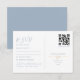 Esta elegante tarjeta de confirmación de boda de doble función, con tonos blancos y azul polvoriento minimalista, aporta un toque contemporáneo, con espacio para los nombres de los invitados y selecciones de menú. Los invitados pueden confirmar sin esfuerzo utilizando el código QR o elegir enviarla de vuelta de manera tradicional como una postal con franqueo. Ideal para una boda elegante y moderna que equilibra la comodidad con la tradición atemporal.
