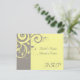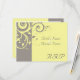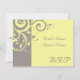 Tarjeta de confirmación para combinar con nuestra invitación de boda con espiral inversa de amarillo y gris, con un fondo de hoja de scroll con espiral gráfico suave y elegante. Personalice en línea con los detalles de su boda.