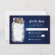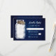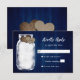Tarjeta de confirmación de boda rústica azul marino con un frasco de mason y dos corazones de arpillera con iniciales sobre un fondo de madera rústica. Personalice fácilmente esta linda tarjeta de confirmación de boda rústica azul marino en línea.