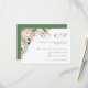 Tarjeta de confirmación de boda floral en negrita con un arreglo floral en la esquina superior izquierda de la tarjeta con protea blanca, bayas moradas, follaje gris azulado y algo de hierba de pampas.