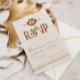 Una tarjeta de confirmación de boda occidental moderna con tonos neutros cálidos y patrones audaces inspirados en el suroeste. Perfecta para bodas de rancho, desierto o al aire libre con un ambiente occidental semiformal. Disponible como invitaciones impresas profesionalmente o como archivo digital conveniente para compartir fácilmente.