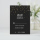 Esta elegante tarjeta de respuesta RSVP de compromiso con confeti dorado sobre fondo negro es perfecta para una fiesta de compromiso elegante. El diseño presenta confeti dorado falso sobre un fondo negro con caligrafía blanca.